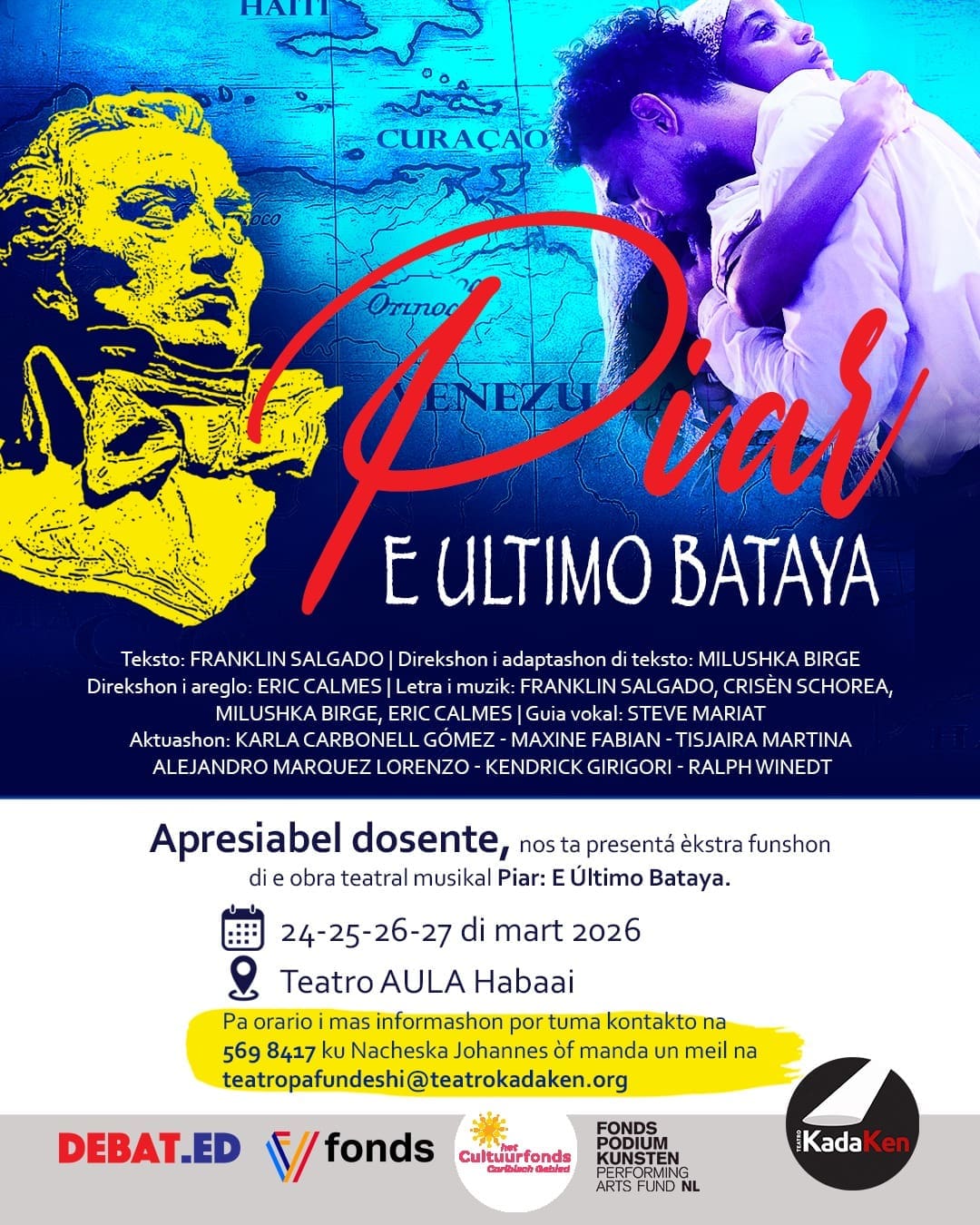 Voor meer informatie over de uitvoering van de schoolvoorstellingen kunt u contact nemen via de volgende mobiele nummers 569 8417/672 4580 of per mail teatropafundeshi@teatrokadaken.org